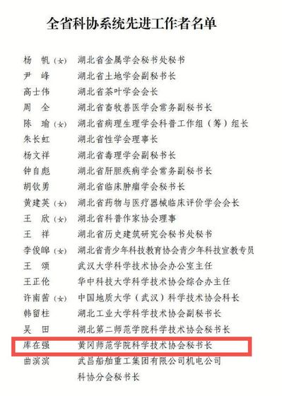 本网讯 8月31日上午,湖北省科学技术协会第十次代表大会在武汉开幕,会议宣布了全省科协系统先进集体和先进工作者名单。我校科协秘书长库在强同志荣获“全省科协系统先进工作者”称号。