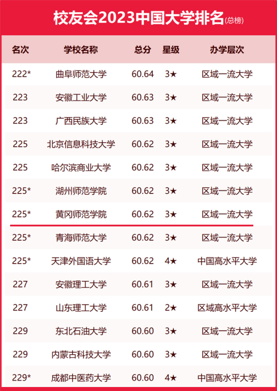 网讯  46日,全国第三方大学评价机构艾瑞深校友会网(Cuaa.Net)正式发布2023中国大学排名榜单,我校位居全国225位,较去年提升31位,连续4年创造历史最好成绩。