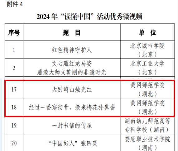 本网讯 近日,教育部关工委发布《教育部关工委关于公布2024年“读懂中国”活动入选作品名单的通知》(教关委函〔2024〕18号),我校选送的作品在全国评比中取得优异成绩。马克思主义学院《繁霜尽是心头血,洒向千峰秋叶丹》荣获最佳征文并入选中国教育电视台展播;传媒与影视学院《大别崎山烛光红》《经过一番寒彻骨,换来梅花扑鼻香》荣获优秀微视频。学校荣获2024年教育部“读懂中国”活动表扬单位荣誉称号。学校连续4年蝉联教育部“读懂中国”活动最佳奖,取得了此项赛事的创新突破。